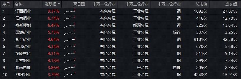 成份股方面,江西铜业领涨超9%,云南铜业、盛新锂能涨逾6%,国城矿业涨超5%,紫金矿业、西部矿业、铜陵有色、北方铜业等个股跟涨。